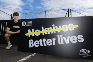 As part of the campaign, No Knives, Better Lives supported awareness activity at Saturday’s William Hill Premiership match between St Mirren and Aberdeen at The SMiSA Stadium. This included NKBL messaging displayed on screens within the stadium and Police Scotland Youth Volunteers handing out leaflets outside the ground.